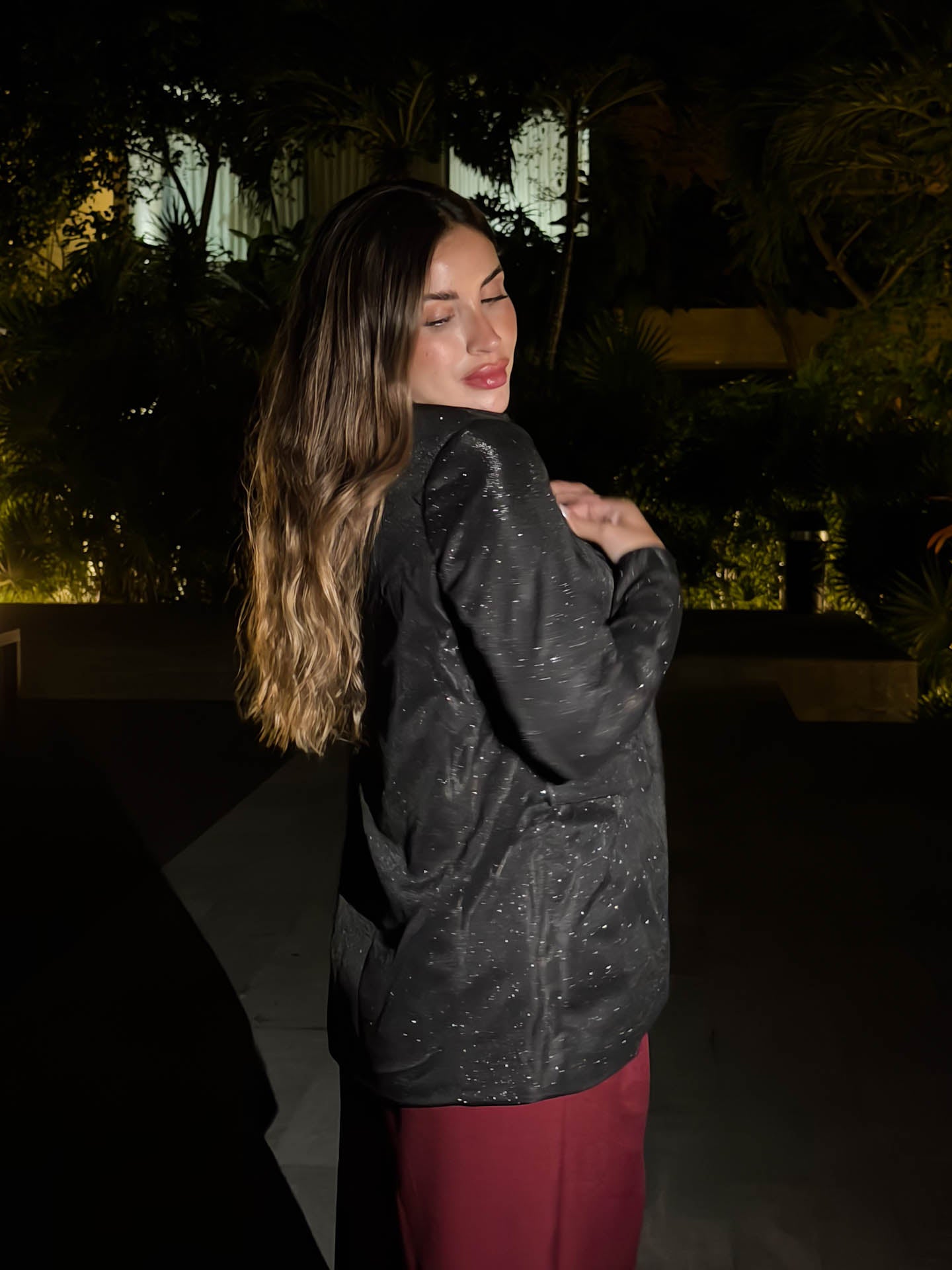 El Blazer Stardust Negro Brillo destaca por su silueta estructurada con hombres que realzan la postura y aportan carácter, junto a un acabado luminoso, elegante y cómodo.