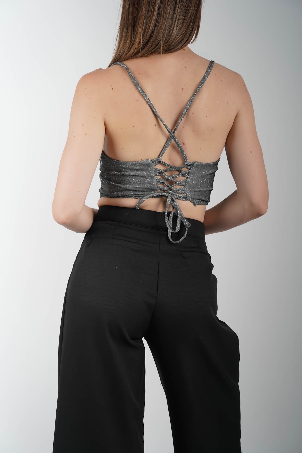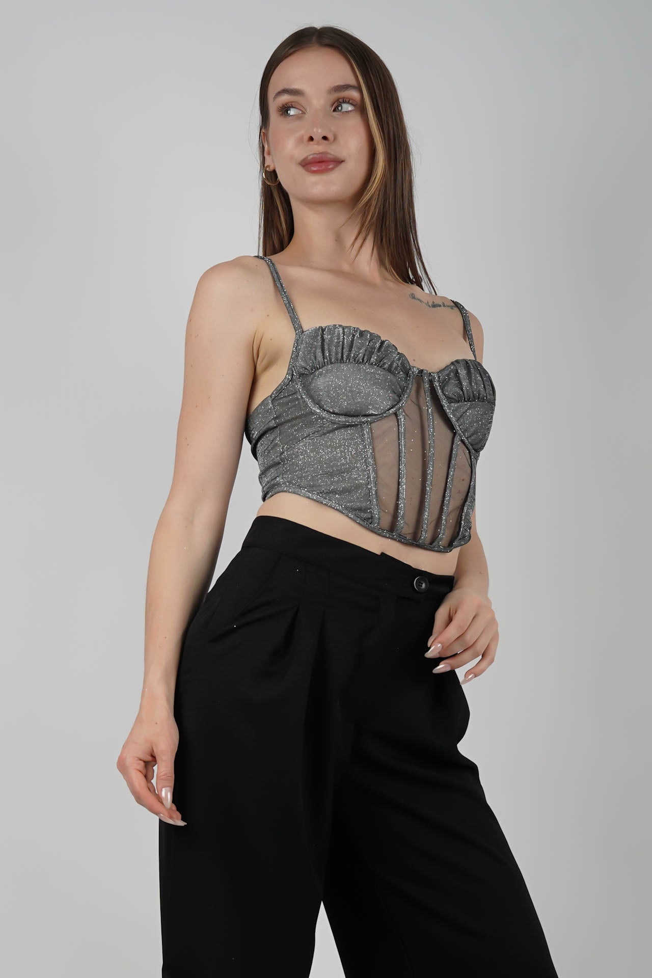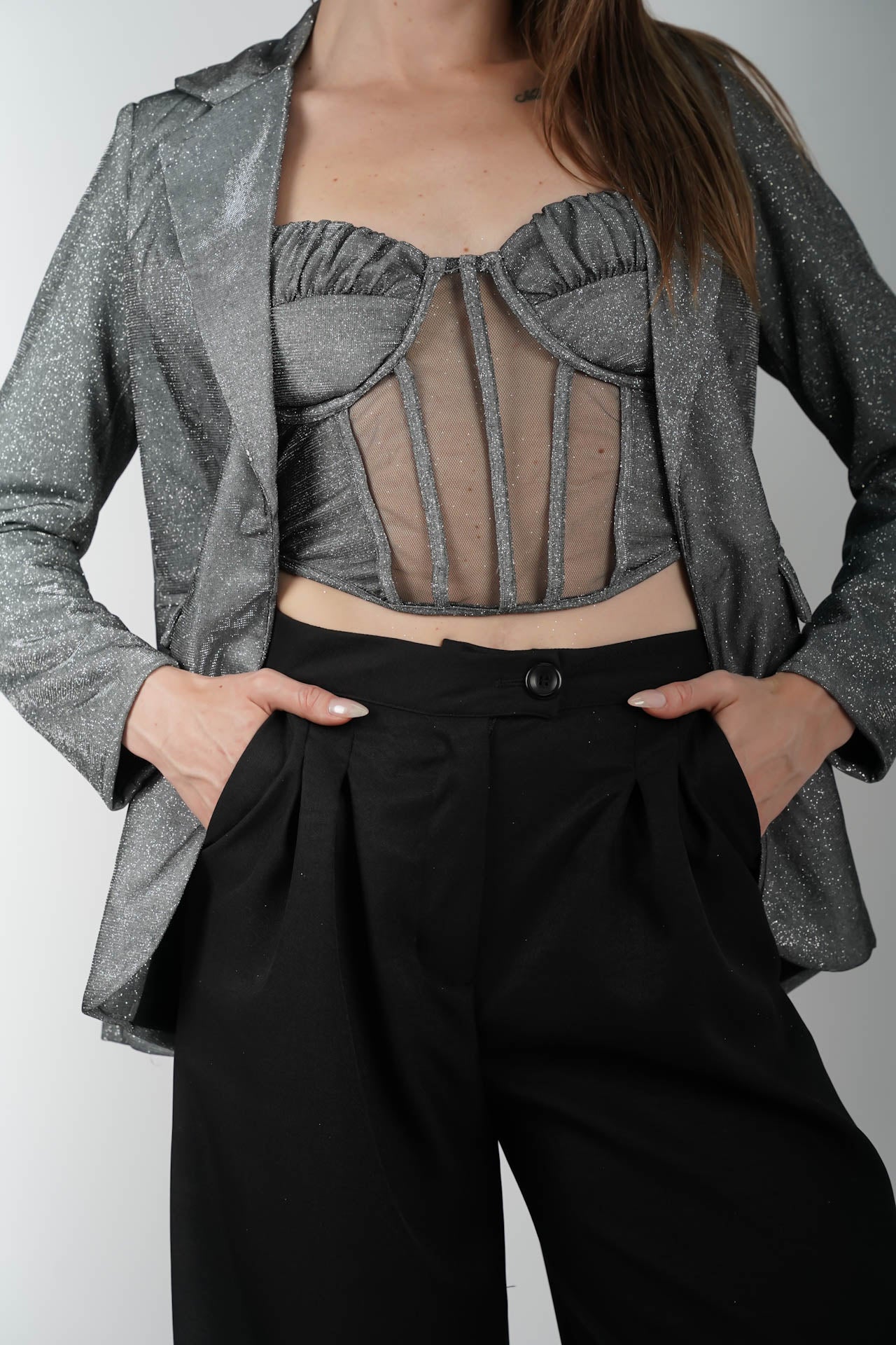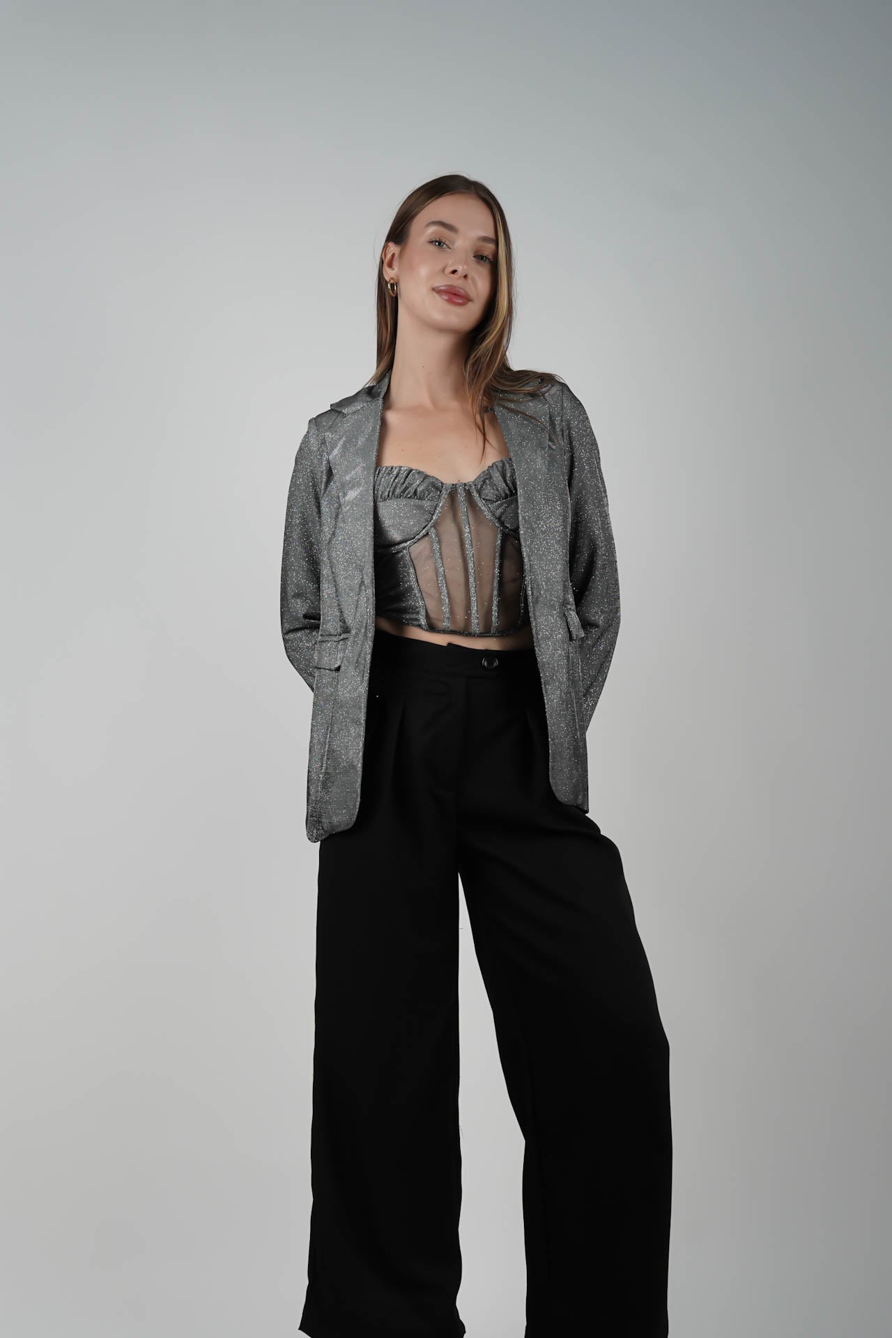 El Corset Stardust Negro Brillo realza la cintura y aporta un brillo sutil que eleva cualquier outfit, manteniendo un look sofisticado y femenino.