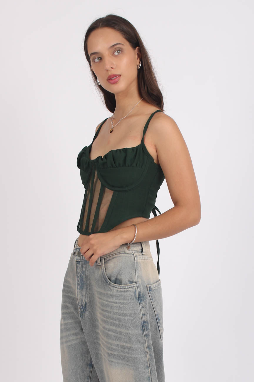 Corset sastre a la cintura con detalle de transparencia frontal, fruncido en el busto, copas estructuradas, varillas internas y asas ajustables en la espalda. El balance perfecto entre sensualidad y elegancia.