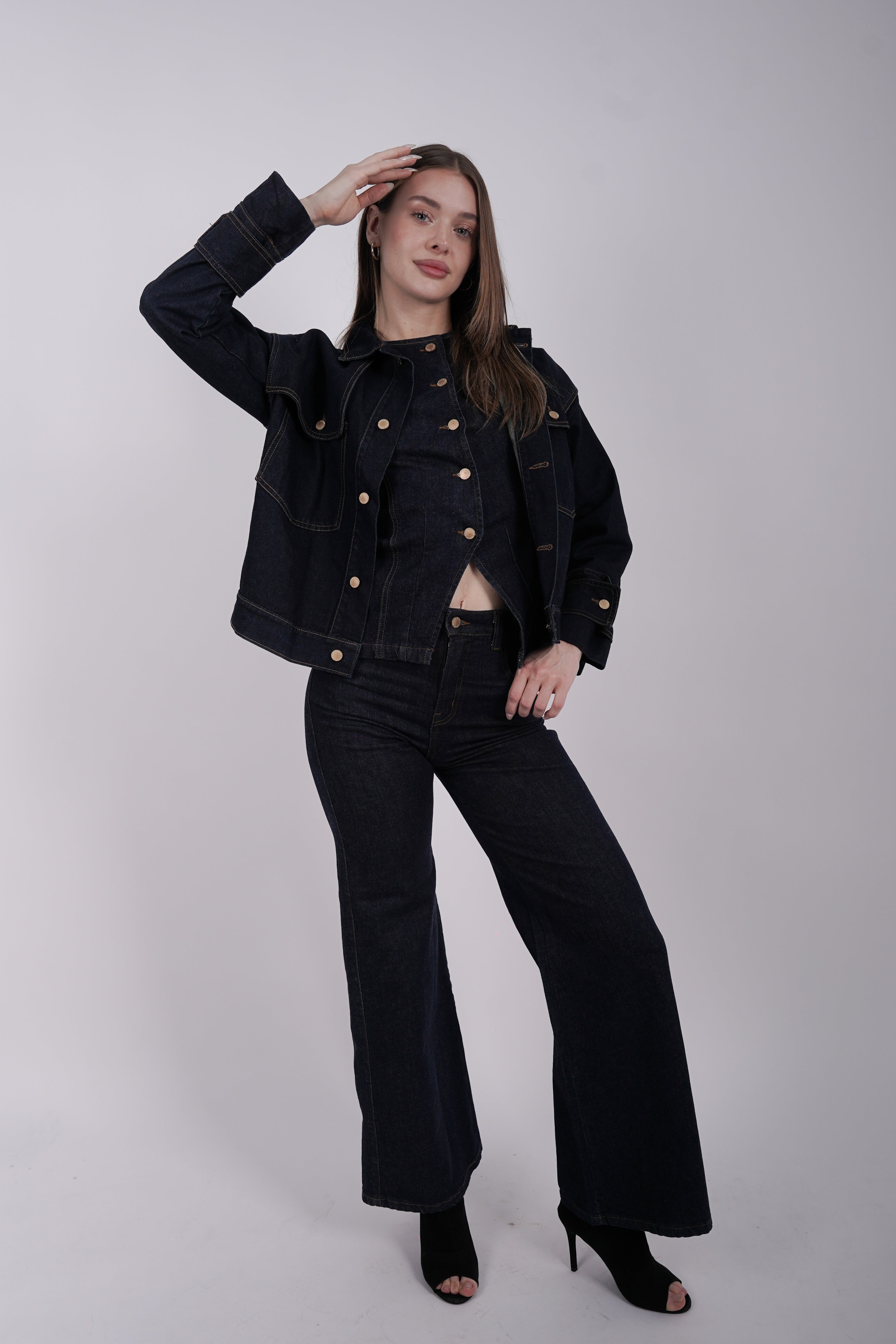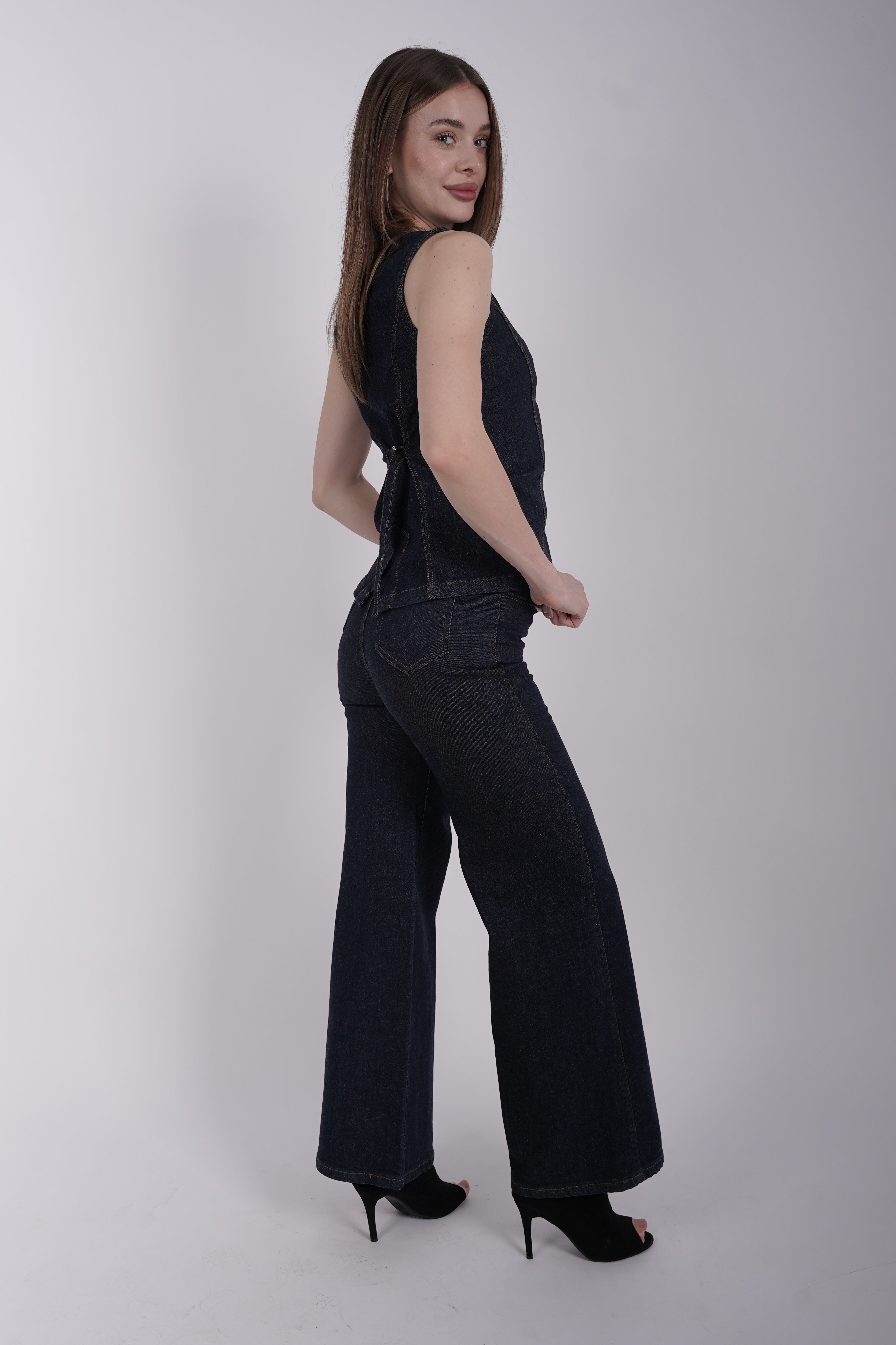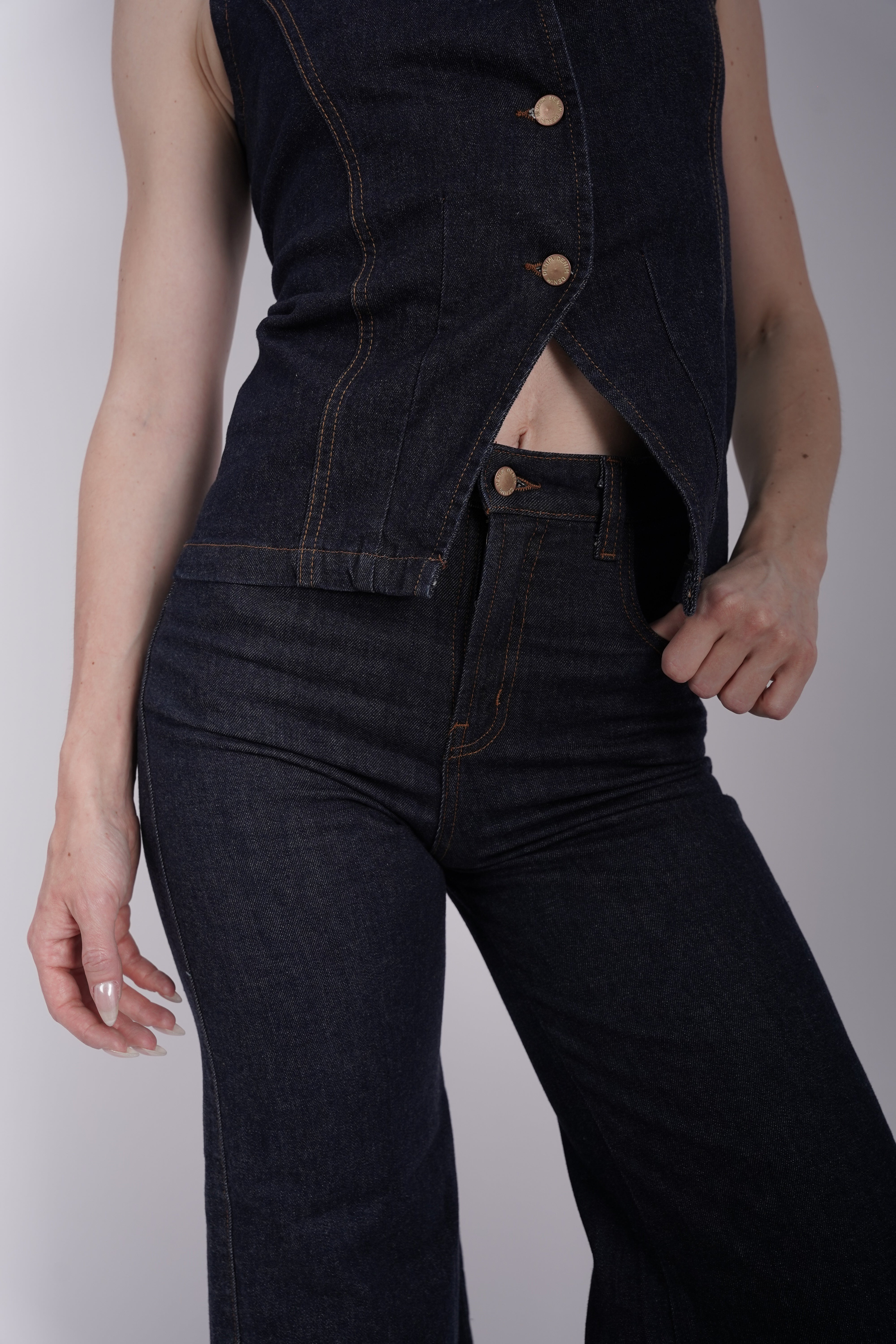 Hecho en algodón peruano 100%, con tejido denim elástico que se adapta al cuerpo sin perder su forma. Diseño wide leg y cintura elasticada para máximo confort y estilo. Su tono dark denim con detalles en hilo camel lo convierte en un básico versátil y moderno.