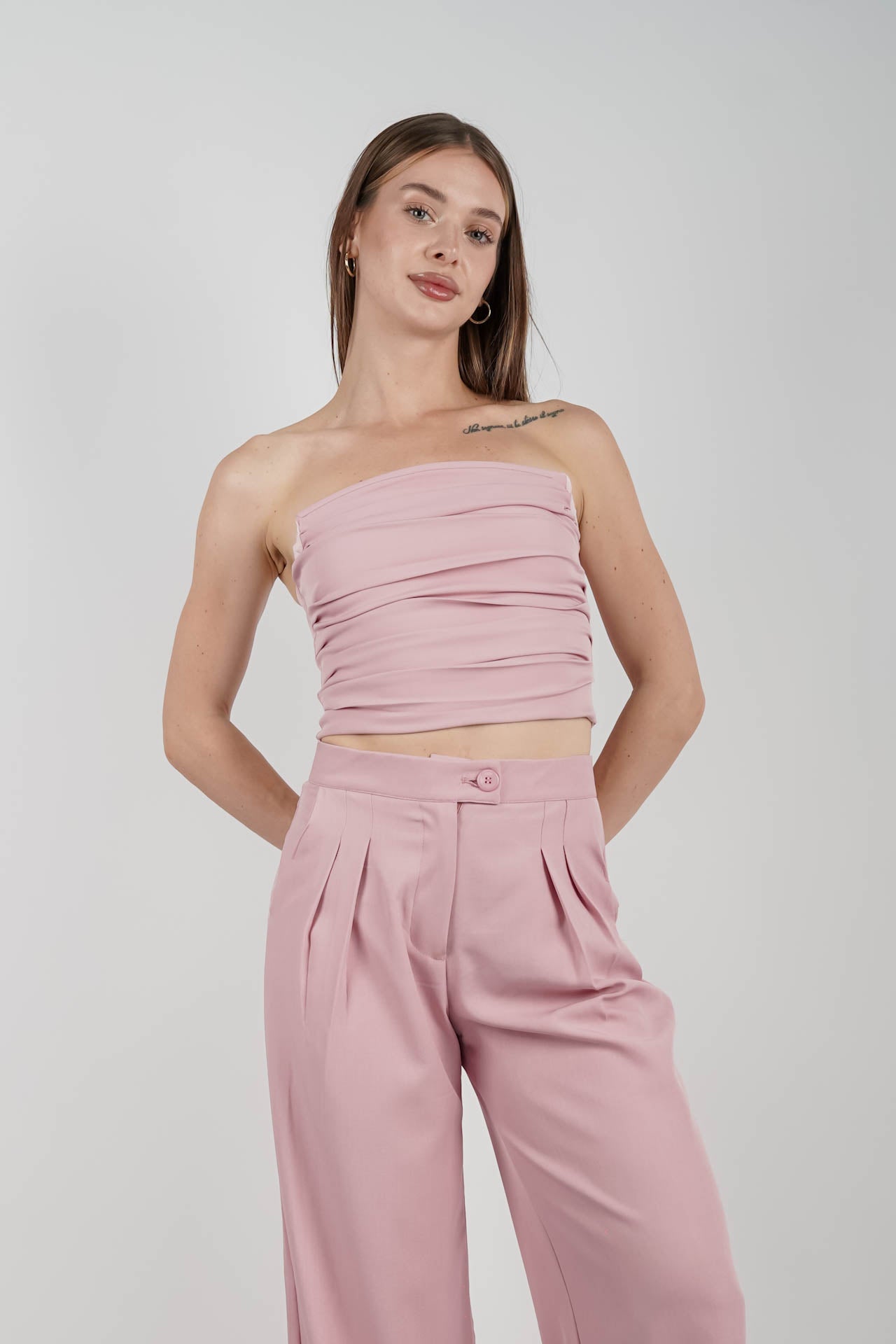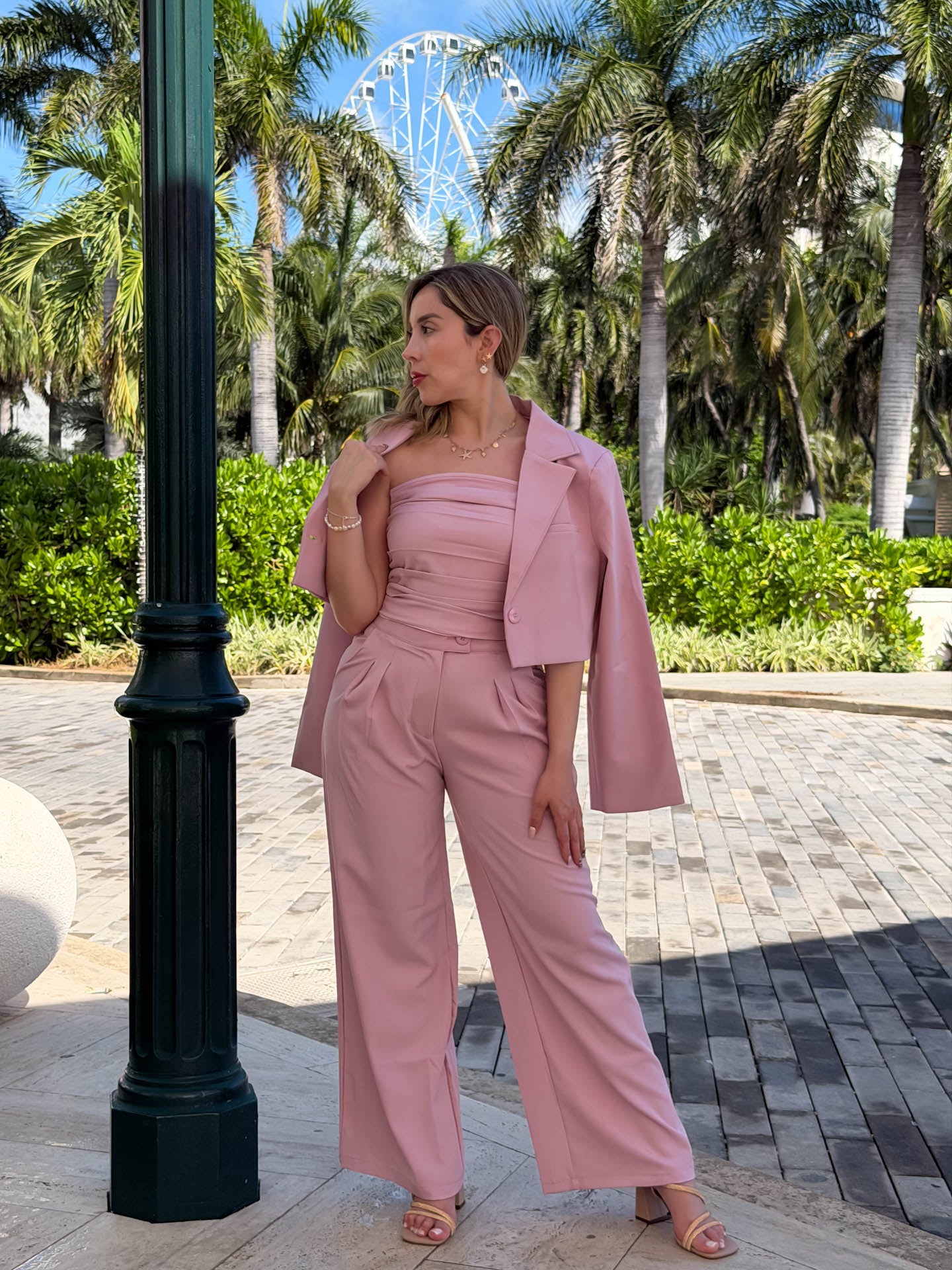 Pantalón de sastrería en tela Aruba, una fibra fresca, suave y con una caída ligera ideal para los días de verano. Su corte palazzo y las pinzas frontales aportan estructura al diseño, acompañado de bolsillos delanteros funcionales y un detalle de solapa trasera que eleva el acabado.