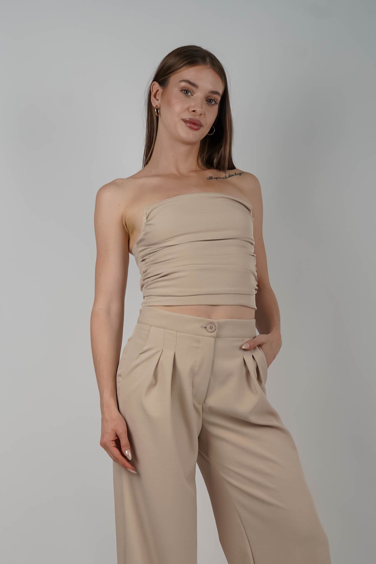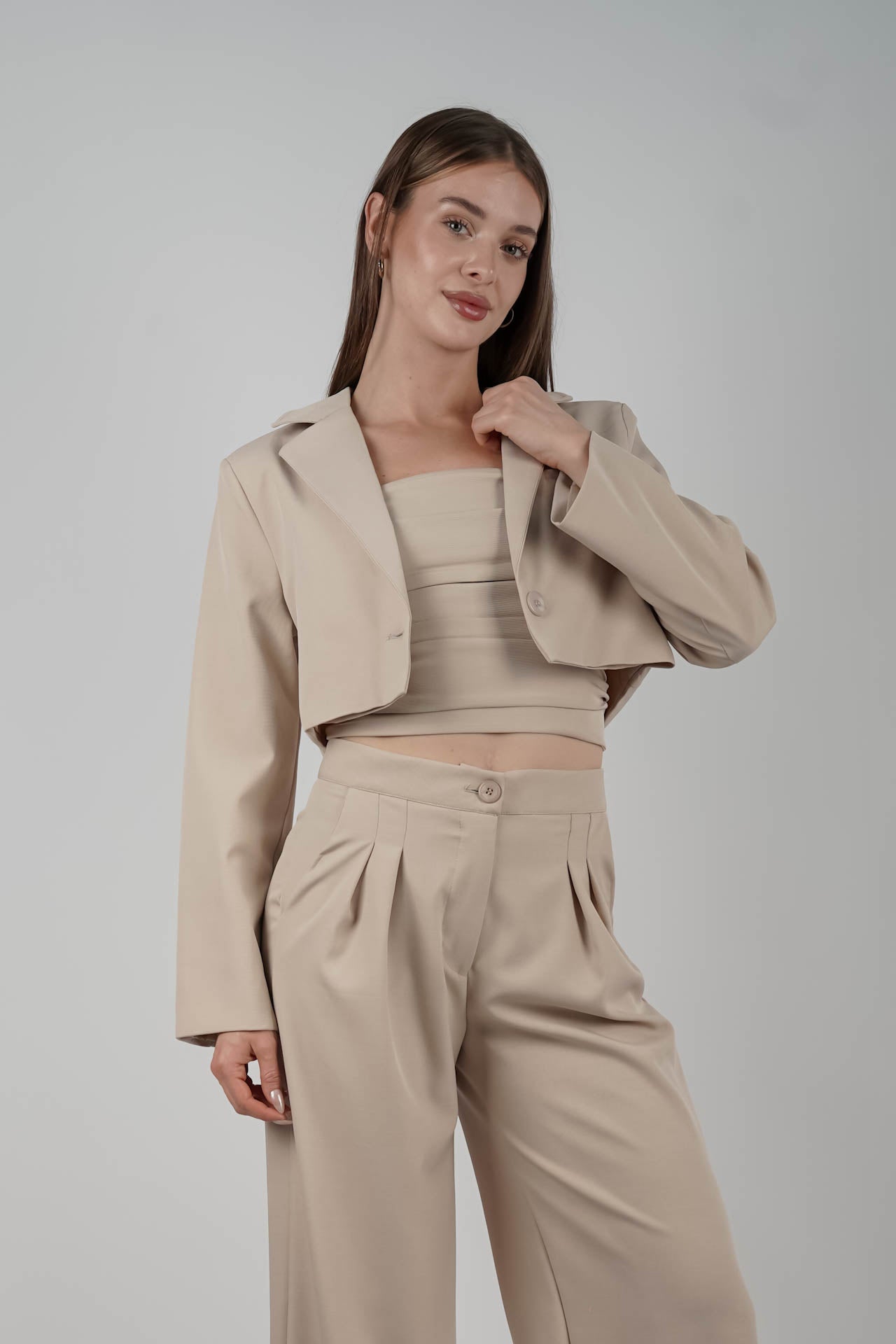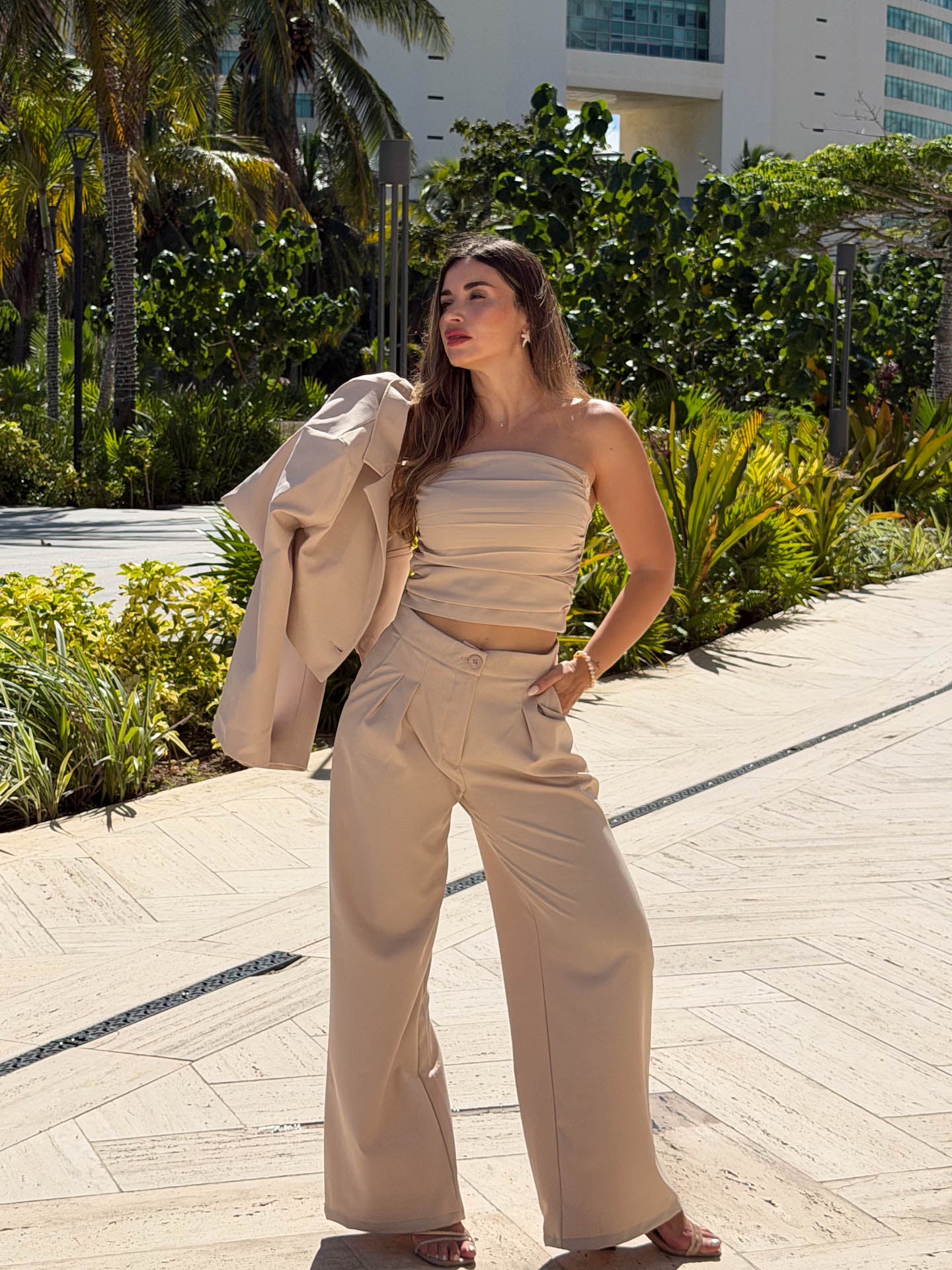 Pantalón de sastrería en tela Aruba, una fibra fresca, suave y con una caída ligera ideal para los días de verano. Su corte palazzo y las pinzas frontales aportan estructura al diseño, acompañado de bolsillos delanteros funcionales y un detalle de solapa trasera que eleva el acabado.