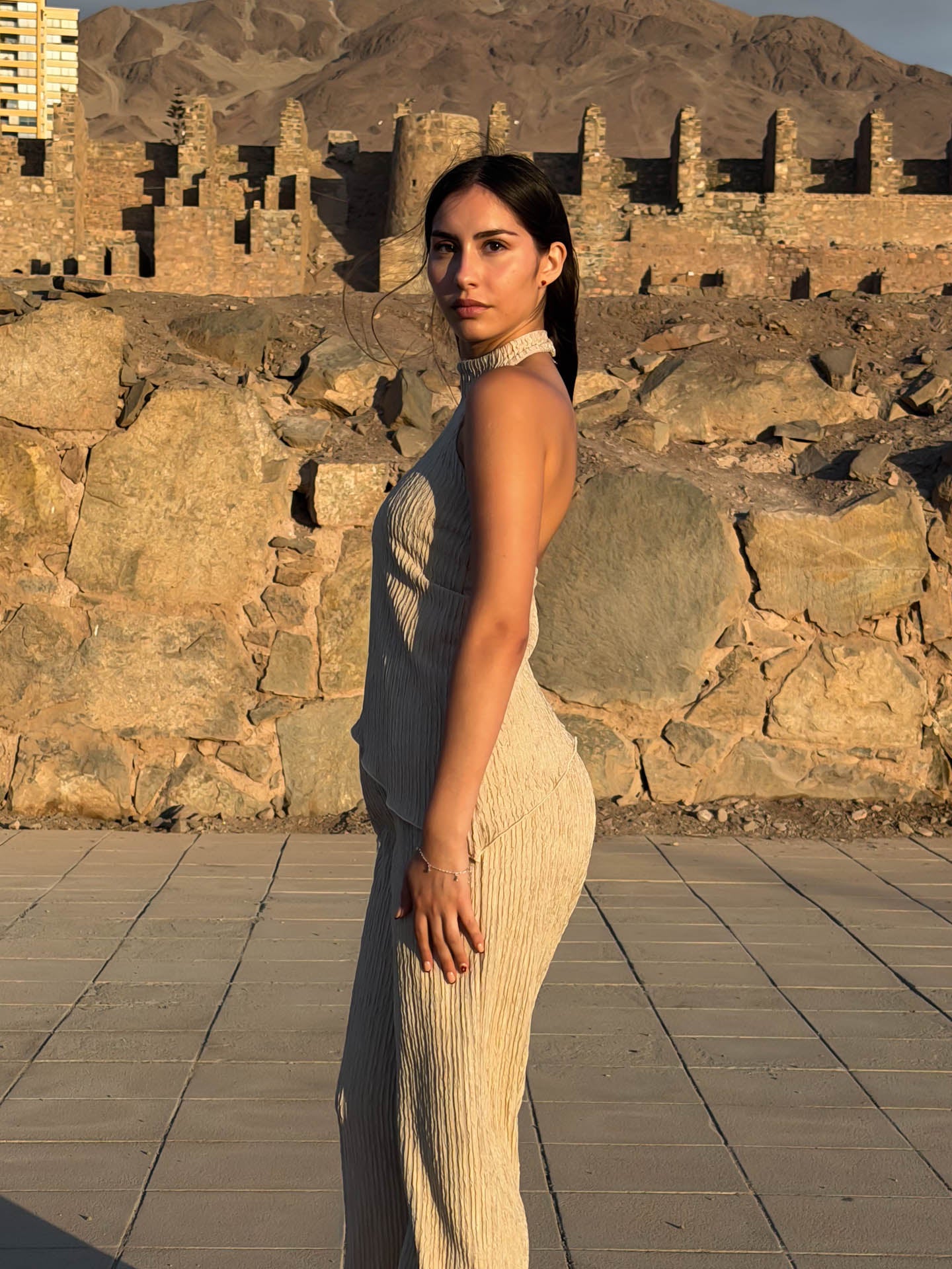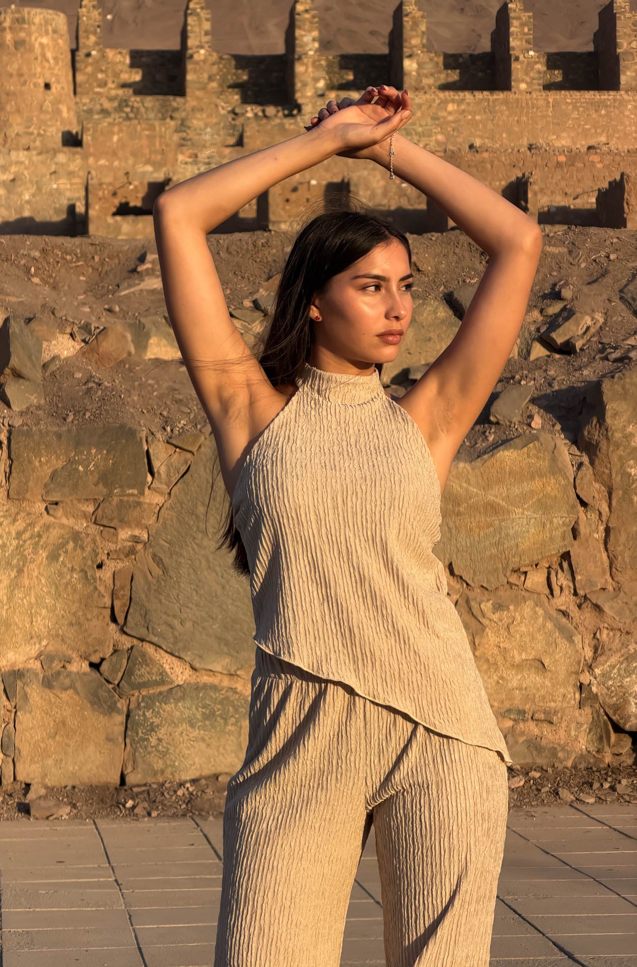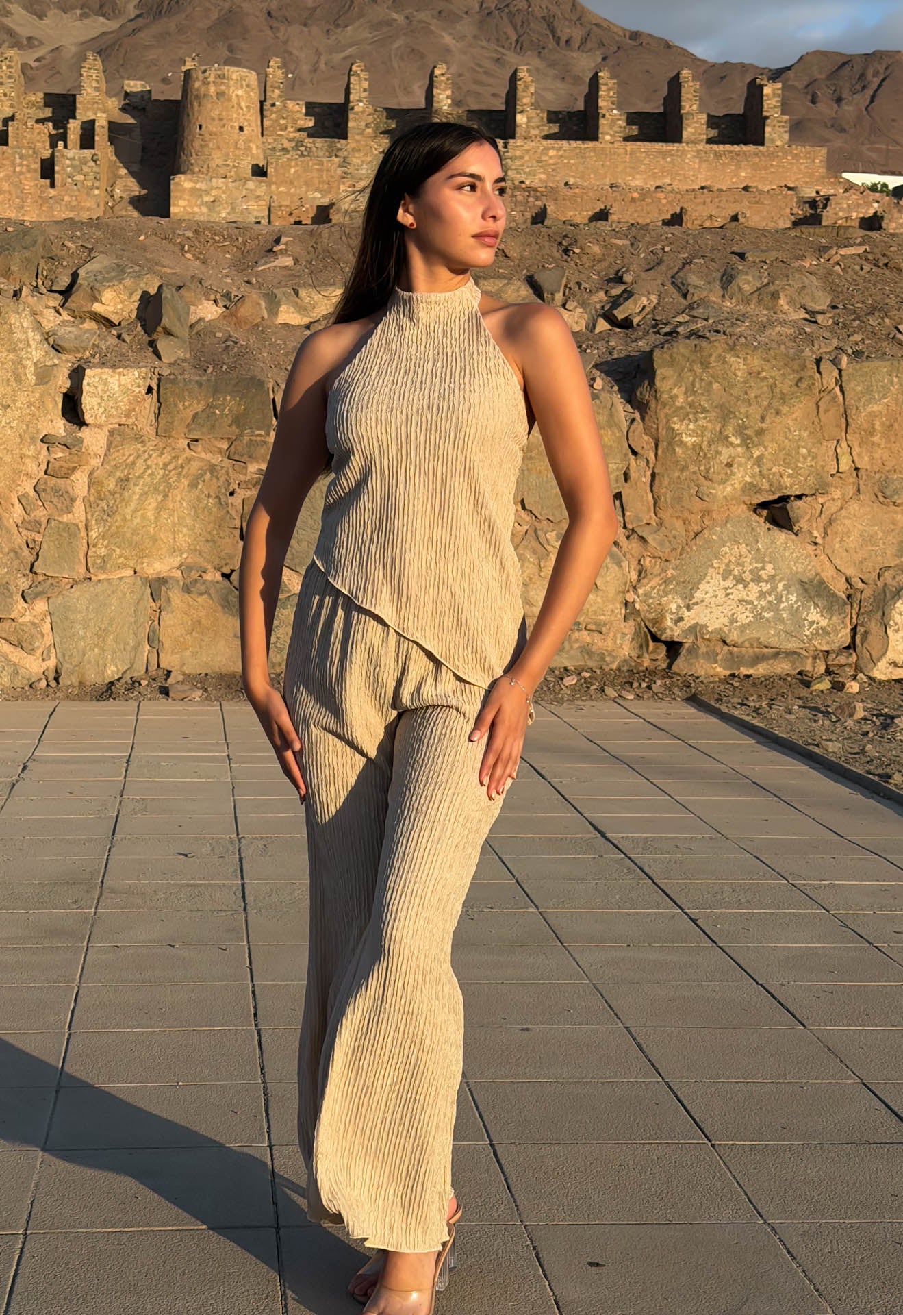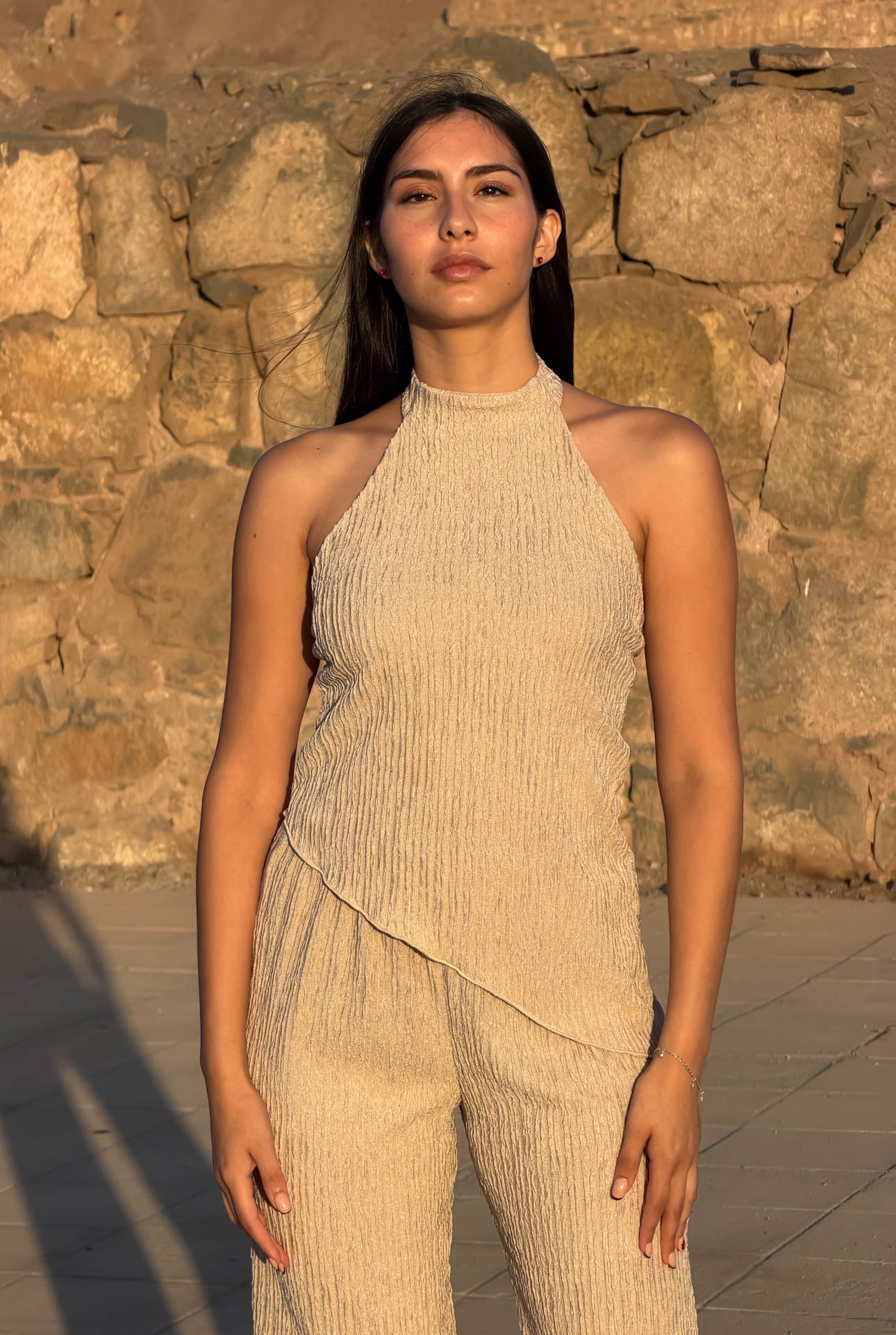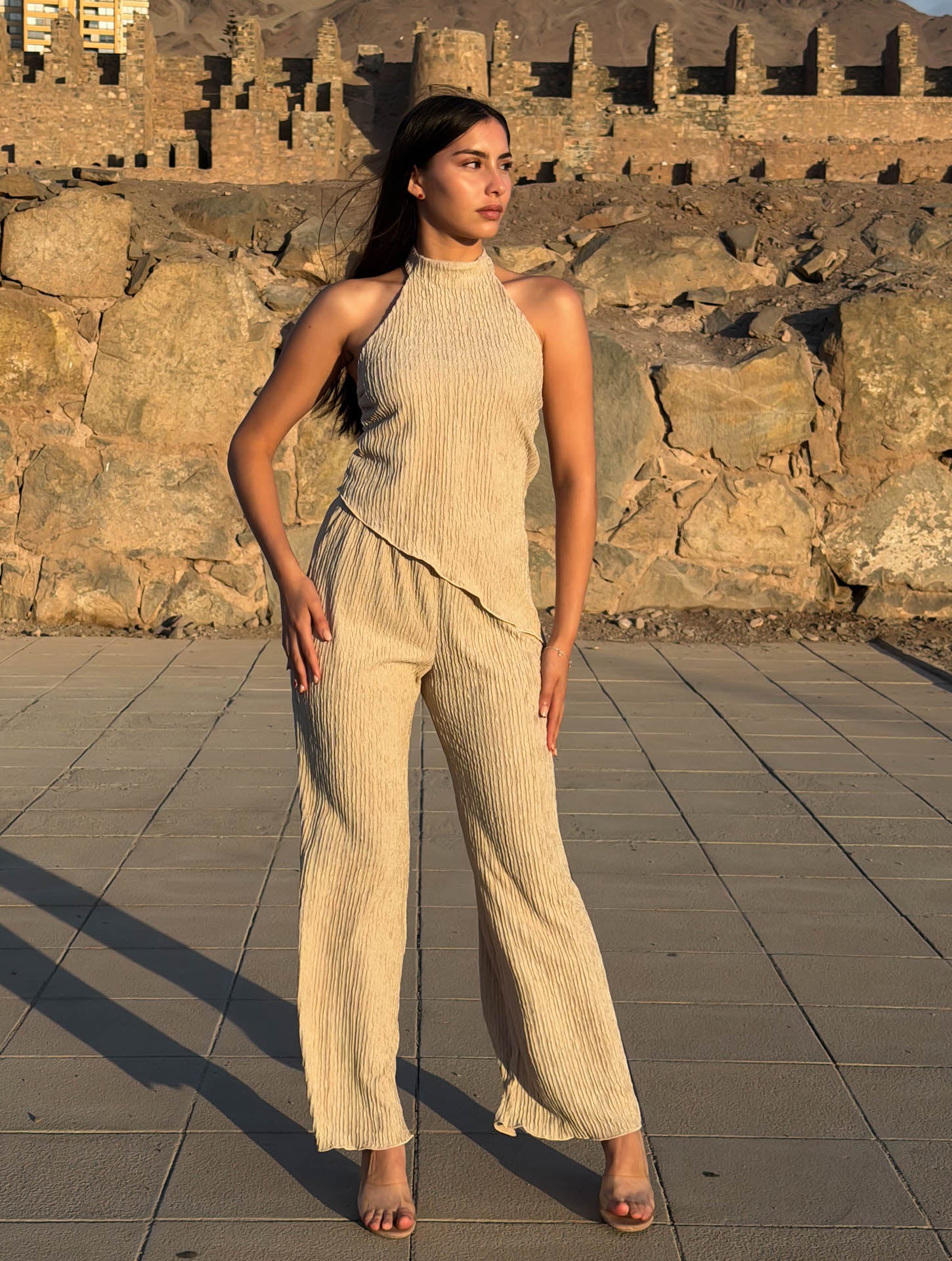 Set de pantalón y top en tela lacoste texturizada, ideal para el verano por su ligereza y frescura. El pantalón corte flare incorpora elástico en la cintura para un calce cómodo y favorecedor. El top, de silueta holgada y sofisticada, presenta una media espalda sutilmente descubierta que aporta elegancia sin exceso, y se ajusta en el cuello mediante botón delicado. Un conjunto versátil y atemporal, pensado para un look pulido y sin esfuerzo.