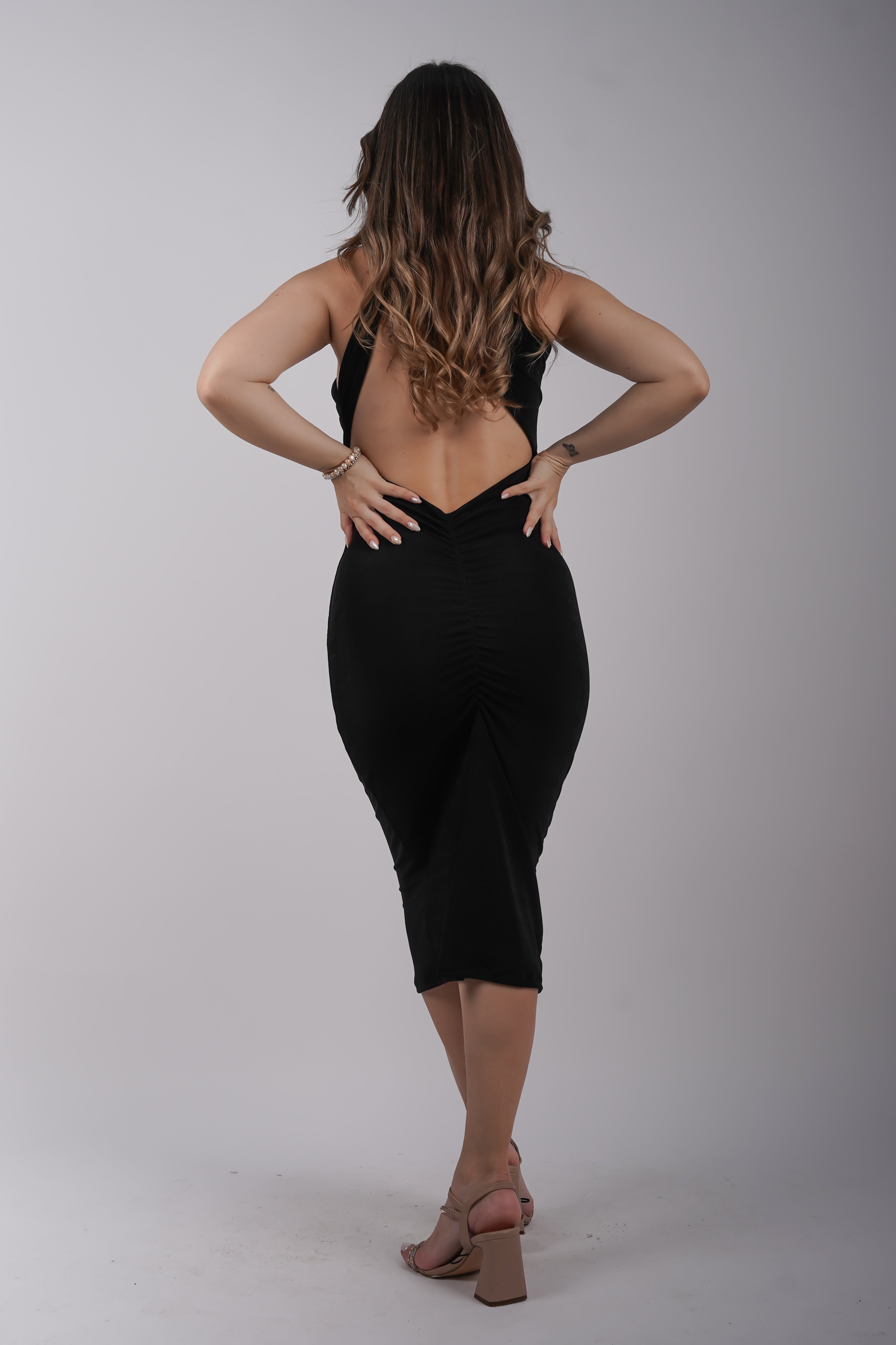 Vestido confeccionado en tela de acetato brillante, con una caída fluida que ilumina la silueta. El cut out frontal aporta un detalle moderno y llamativo, mientras el diseño sin espalda añade un toque sofisticado y sensual. Una pieza pensada para destacar, brillar y derrochar sensualidad.